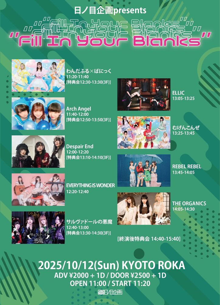 日ノ目企画presents "Fill In Your Blanks" SCHEDULE 2025/10/12(日) 京都ROKA 10/12(日)日ノ目企画presents "Fill In Your Blanks"@京都ROKA 前売2,000円/当日2,500円(+各1D) 出演14:05-14:30 物販14:40-15:40 [特典]Point5pt(or写メ券) ※2day通し特典あり(計3本予定) ※お目当てTHE ORGANICSをご選択下さい チケットを見る URLをコピーする 報告する
